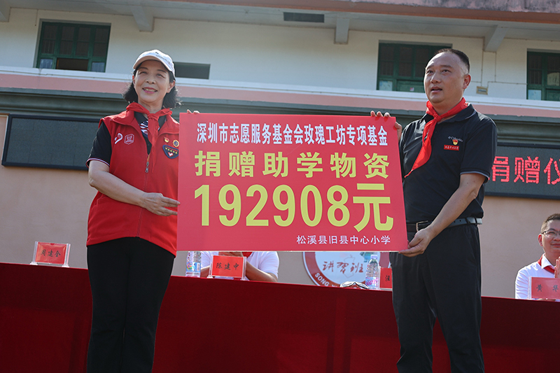 深圳市志愿者联合会赛会展会组大组长、玫瑰工坊基金负责人汪克莉、深圳市易中电子有限公司总经理季招亮,分别分享了历年来爱心助学感言,然后将捐赠牌匾,双手递给周建全校长,并表示以后,还会来看望学生们。