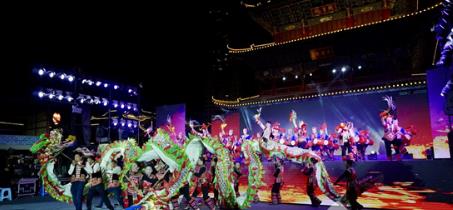 非遗长街宴上,彝族特色美食香气扑鼻,游客与当地人围坐一桌,吃彝族饭、唱彝族歌,席间互动频频、笑语不断。夜幕降临,嶍峨古镇化身欢乐海洋。