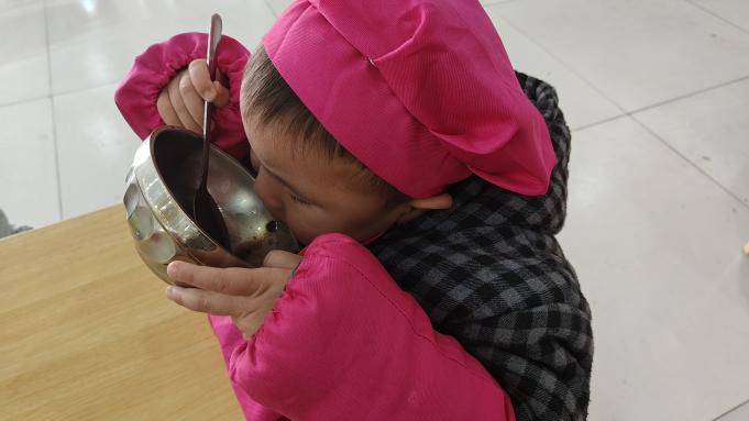 当热气腾腾的腊八粥端上桌,孩子们的眼睛里满是欢喜。大班幼儿主动为弟弟妹妹盛粥,看着他们抱着小碗吃得香甜,自己才开心地端起碗品尝。有的孩子将粥喝得干干净净,还不忘舔去嘴角的米粒;有的孩子举着空碗,奶声奶气地请求添饭。一碗热粥下肚,不仅温暖了孩子们的胃,更让他们在分享与陪伴中,体会到了传统节日的温情。