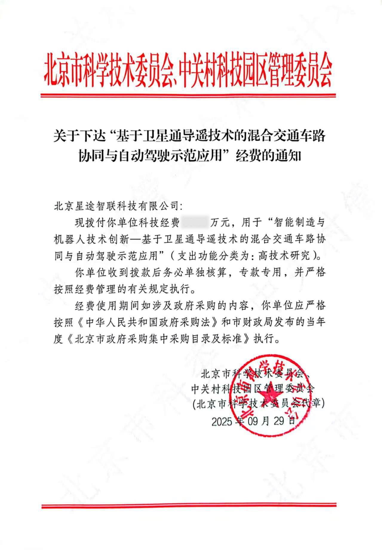 近日,北京星途智联科技有限公司传来创新进展——凭借“基于卫星通导遥技术的混合交通车路协同与自动驾驶示范应用”项目,公司成功获得北京市科学技术委员会、中关村科技园区管理委员会拨付的专项科研经费支持。该项目聚焦卫星通导遥技术与车路协同、自动驾驶的深度融合,旨在通过技术攻关推动智能交通场景落地。此次获资不仅是对星途智联技术创新能力的高度认可,更标志着其在卫星技术赋能交通领域的探索迈入新阶段,为行业协同发展注入新动能。