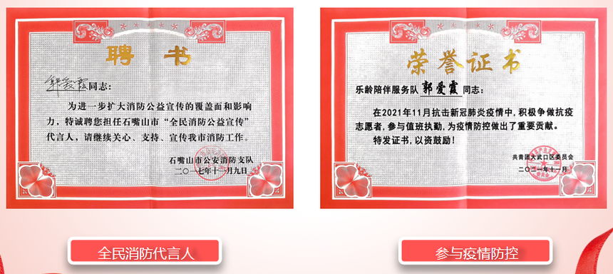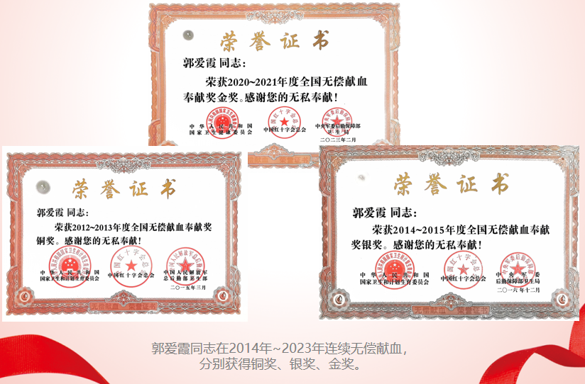 身体发肤受之父母,郭爱霞是广大人民群众共同的女儿,她以别样的方式反哺着社会,2012至2013年度,郭爱霞同志获得了无偿献血奉献奖铜奖。2014年9月大武口区志愿者协会评选郭爱霞优秀志愿者。接下来在2014至2015年度,郭爱霞同志又获得了无偿献血奉献奖银奖。2015年度,她还被评为石嘴山市“学雷锋”优秀个人志愿者称号。也是在2015年,她获得了“最美大武口人” 的荣誉称号。2015年3月,在表彰全市学雷锋志先进个人的决定中,郭爱霞同志被评为“最美志愿者”。2016年在大武口区第五届道德模范和“最美大武口人”的评选中,郭爱霞同志再次被评为最美志愿者。2017年5月,郭爱霞同志入选中国好人榜候选人。2017年9月,郭爱霞同志被石嘴山市公安消防支队聘请担任石嘴山市“全民消防公益宣传”代言人。2017年10月,郭爱霞同志又一次获得大武口区民政局敬老爱老双星的荣誉称号。2017年12月,郭爱霞同志被石嘴山市爱心互助协会公益活动中志愿服务表现突出,获得“爱心奉献奖”。2018年12月大武口区志愿者协会为郭爱霞同志颁发“优秀志愿者奉献奖”。2019年12月郭爱霞同志在宁夏孝文化发展促进会工作中,工作突出评选为“优秀会员”。2020年12月郭爱霞同志在宁夏孝文化疫情防控工作中工作突出,被评为年度“优秀个人”。2020年12月郭爱霞同志被石嘴山市志愿者协会第三届理事评选为“理事”。2021年11月郭爱霞同志在共青团大武口区委员会抗战新冠肺炎疫情中表现突出,被评为“最美奉献者”。2022年12月郭爱霞被石嘴山市志愿者协会评选为“优秀个人”。2022年郭爱霞同志在社区疫情防控工作中表现突出,特授予“最美奉献者”荣誉称号。2023年2月郭爱霞同志经宁夏孝文化发展促进会第二届第一次理事会二次会议通过,成为“理事”。2014年3月郭爱霞同志被宁夏回族自治区老龄健康服务中心,“情暖夕阳健康行”活动中被选为健康祝老志愿者,郭爱霞同志为更多老人带去健康和温暖。2024年3月郭爱霞同志北石嘴山市志愿者协会“最美志愿者”。2020年至2021年郭爱霞同志荣获全国无偿献血“奉献金奖”。
