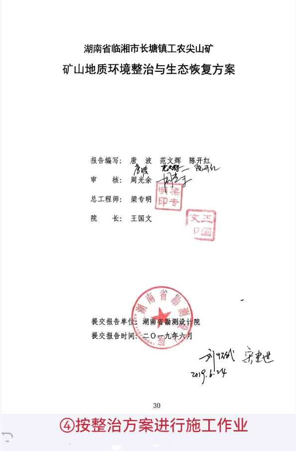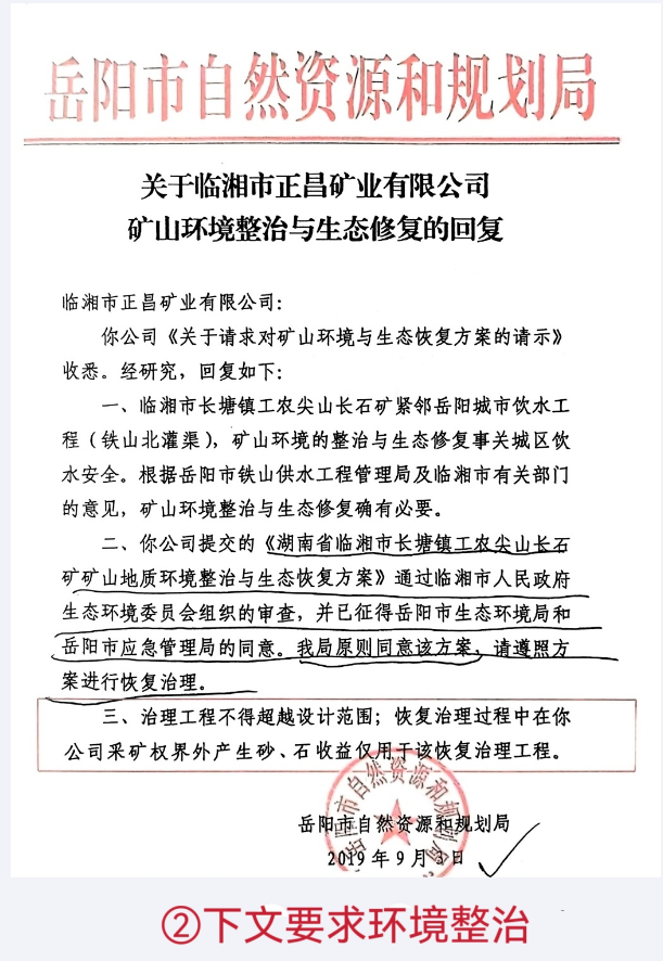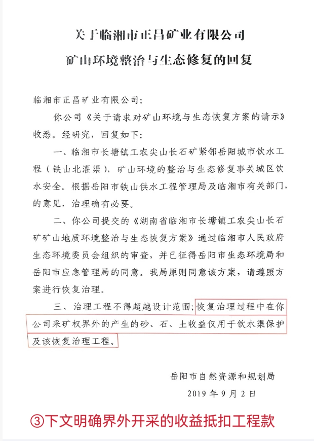 时隔一年后的2019年4月,临湘市自然资源局为落实《水污染防治法》执法检查要求,牵头组织编制《矿山地质环境整治与生态恢复方案》,将正昌矿业矿界内44亩矿山及周边400余亩历史无主矿山、他人矿山纳入整治范围。因整治需要动用界外资源,岳阳市自然资源与规划局、临湘市生态委员会等多部门先后发文授权,明确正昌矿业可通过界外采砂采石收益冲抵复绿整治成本。家属称,企业为此投入4000余万元,采挖154.82万吨砂石土用于填埋整治。