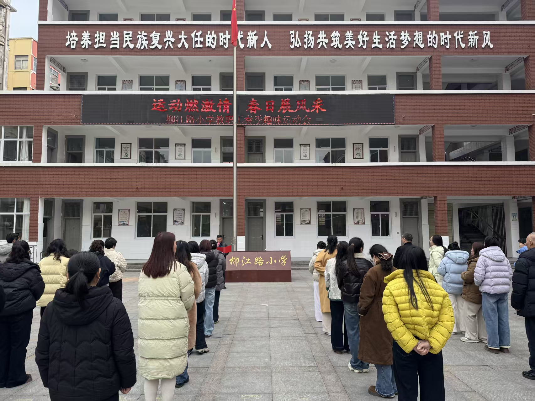 下午14:30,各年级组教师准时在操场旗台前集合,由南至北、按年级顺序列队整齐,精神抖擞。随后,党支部书记、校长万国顺登台发表简短讲话,寄语全体教师以运动强体魄、以拼搏聚合力,并郑重宣布柳江路小学教职工春季趣味运动会正式开始。讲话结束后,全体教职工同步进行拉伸热身,为赛事拉开精彩序幕。