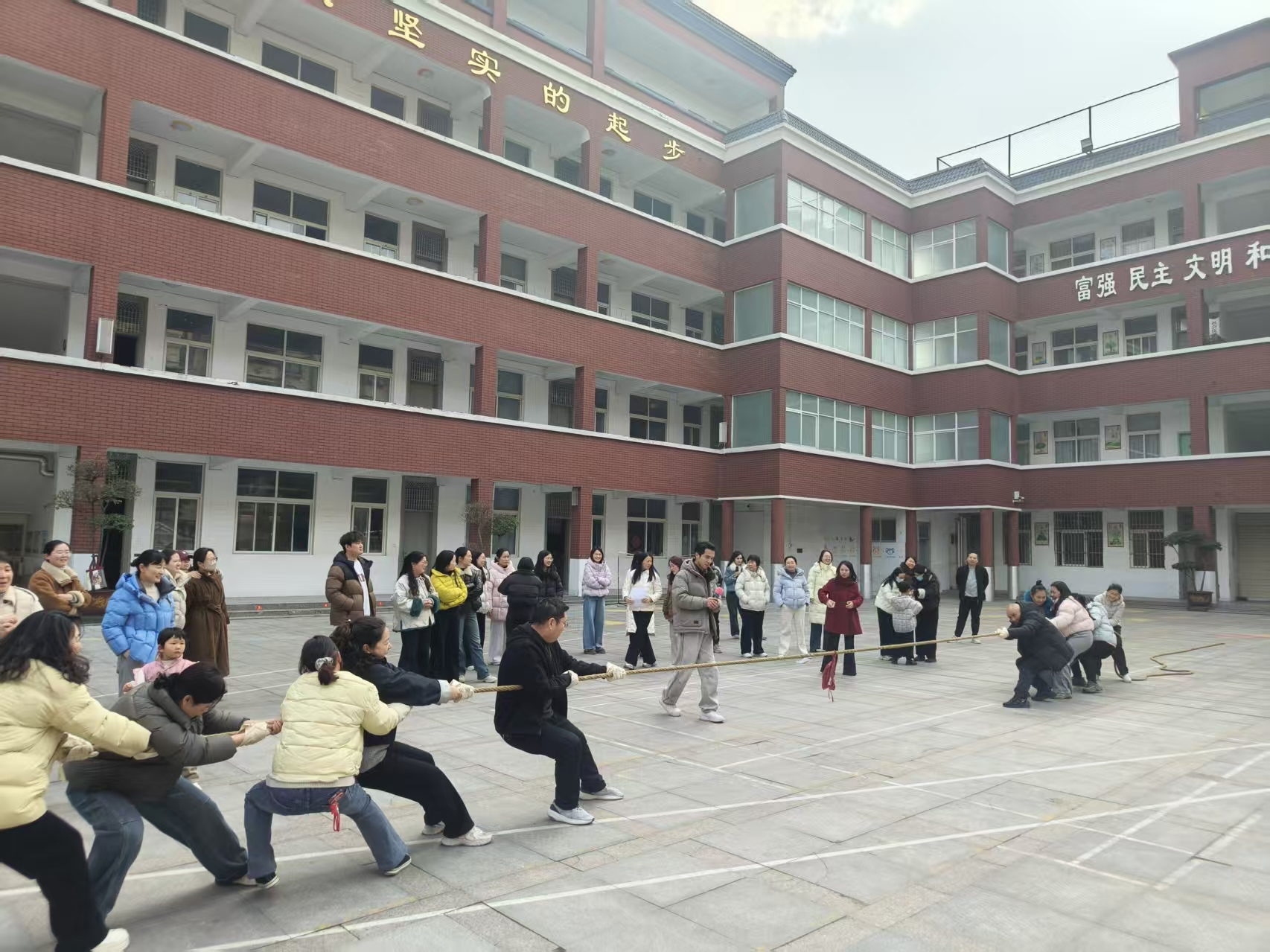 随后的拔河比赛将现场气氛推向高潮。各参赛队伍抽签确定对战顺序后,队员们紧握长绳、脚蹬实地、身体后倾,齐声喊着号子向后发力。整齐的呐喊声、加油声此起彼伏,大家心往一处想、劲往一处使,用汗水诠释着团结协作的真谛,尽显柳江路小学教师坚韧不拔、奋勇拼搏的精神风貌。