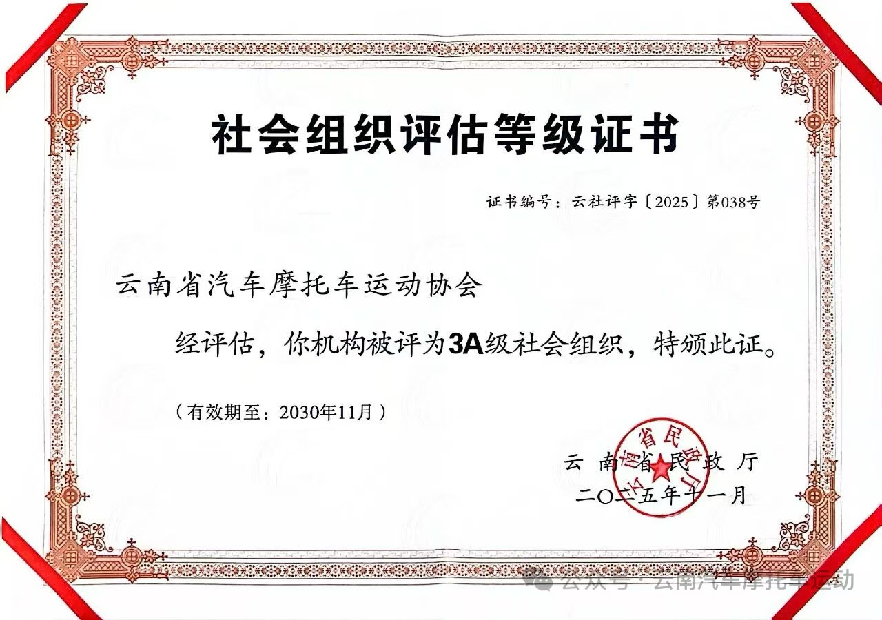在此次评估中,云南省汽车摩托车运动协会首次参评即获评AAA级社会组织,标志着协会在规范化建设与服务能力方面迈上新台阶。近年来,协会坚持党建引领,持续加强自身建设,不断提升服务会员、服务行业、服务社会的能力,发挥体育社会组织政治功能参与社会治理,积极推动汽车摩托车运动融入云南高原特色体育强省建设大局,各项工作取得积极进展,获得了行业管理部门、会员单位及社会各界的广泛认可。